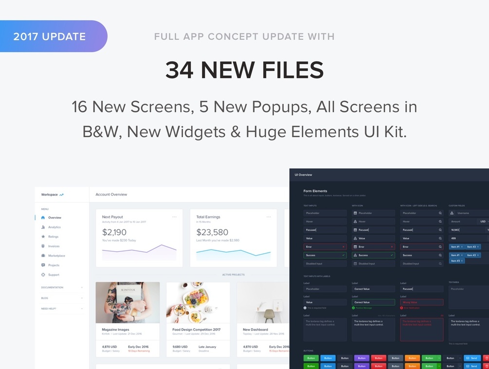 2017 Update - brings the design of a conceptual app for freelancers called Workspace. This time with all connected screens to give you another guide for your new dashboard visual language. See full prototype here: https://marvelapp.com/779c609 - All Workspace screens also come in both White and Black versions. And lastly but also mainly this update gives you by your hand one of the biggest elements pack full of all possible states or every possible form/table elements you can ever think of.